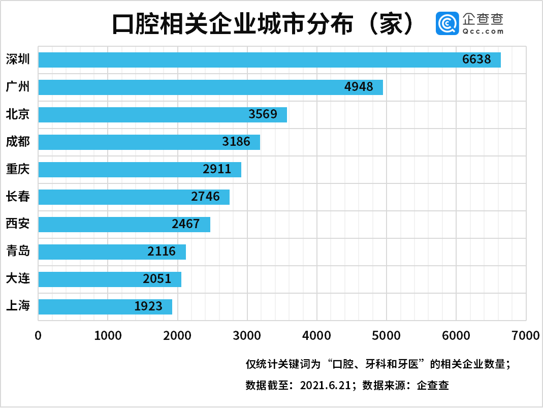 企查查数据显示,我国共有关键词为“口腔”、“牙科”和“牙医”的现存企业14.37万家(下称口腔相关企业),其中广东省以2.07万家摘得魁首,其次是山东、辽宁。