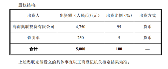 2022年12月9日,奥联电子宣布旗下子公司奥联投资,将和自然人胥明军联手成立一家新公司奥联光能,主攻第三代太阳能电池钙钛矿电池业务。其中奥联投资出资4750万元,持股95%;自然人胥明军出资250万元,占比5%。