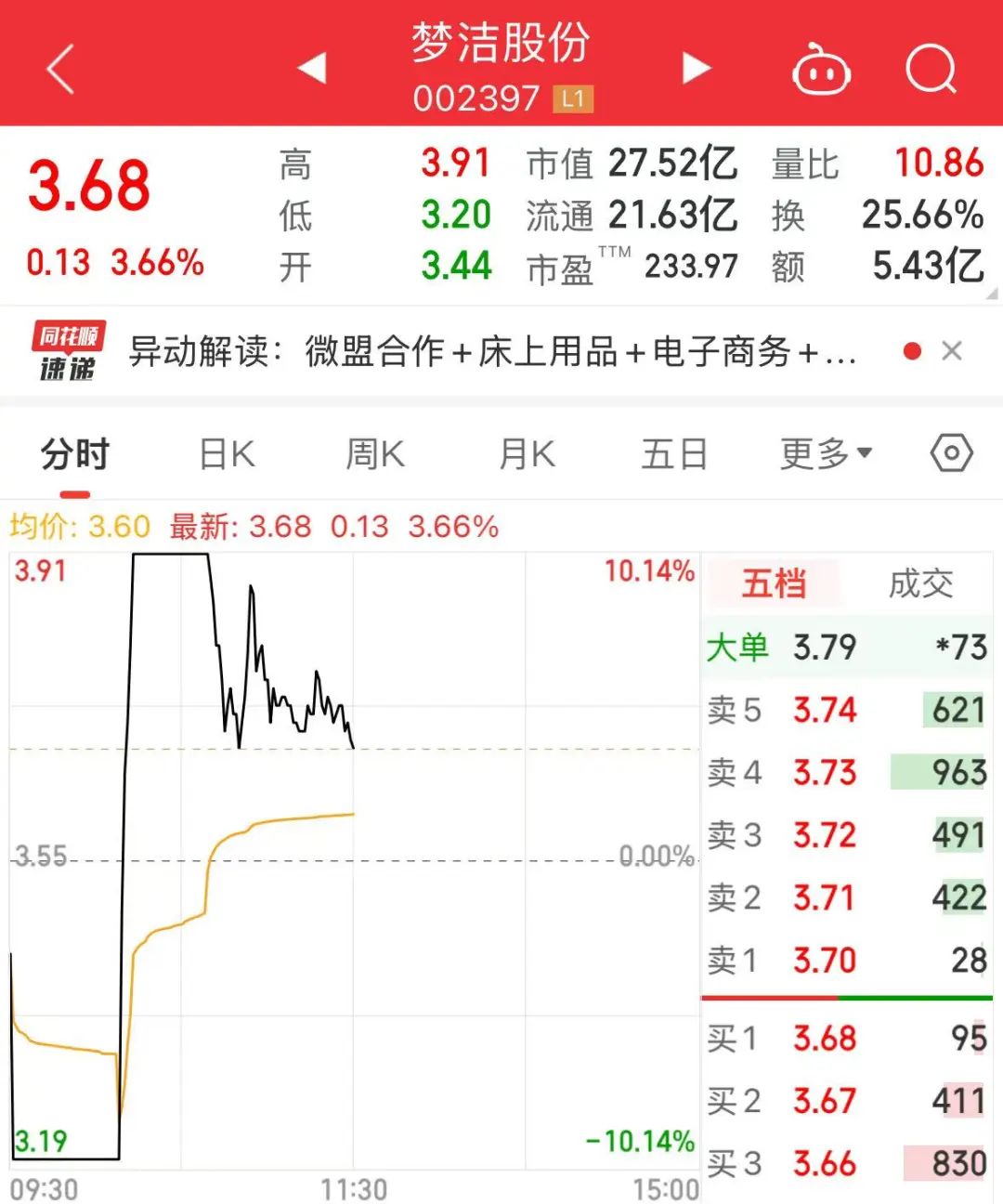 梦洁股份早盘上演“地天板”行情,股价从跌停拉升至涨停,此后打开涨停,未能实现4连板。截至上午收盘,该股上涨3.66%,成交量150.82万股,成交额5.43亿元,振幅达20%,换手率25.66%。