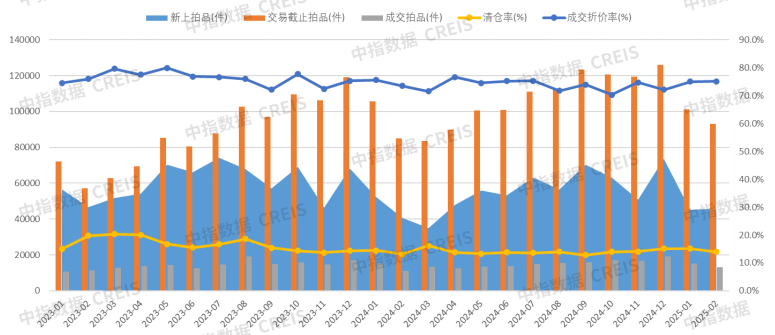 图:2023—2025年2月全国355城法拍市场挂拍、交易趋势