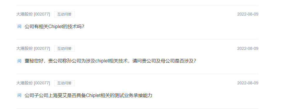 10日晚间,大港股份回复深交所关注函称,公司业务构成未发生重大变化,不涉及Chiplet(芯粒)、锂电池相关业务。