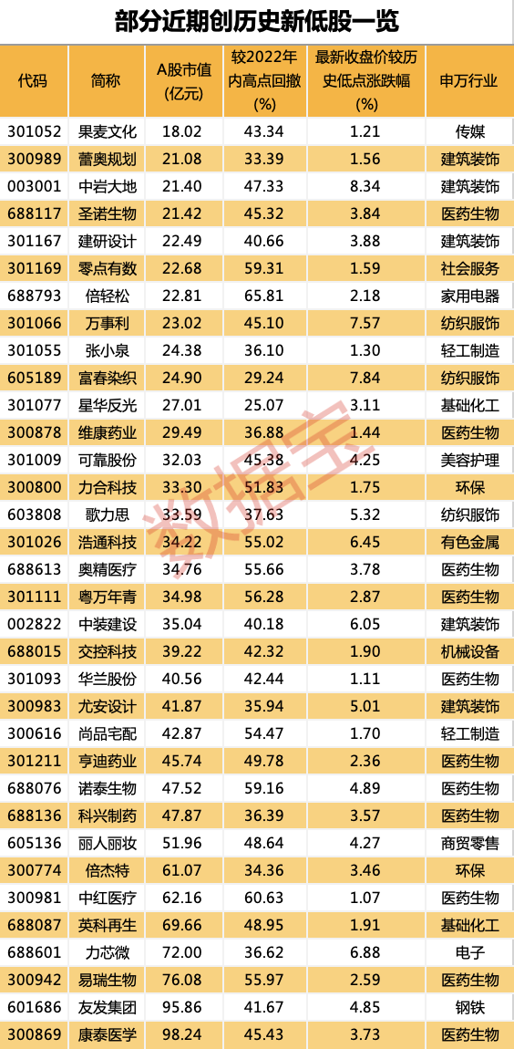 还有哪些处在历史底部附近的股票呢?证券时报·数据宝统计,剔除今年以来上市的次新股,8月以来,股价一度创历史新低且最新收盘价较历史低点涨幅不足10%的股票,共计50股。总体来看,这些股票具备三大特征。