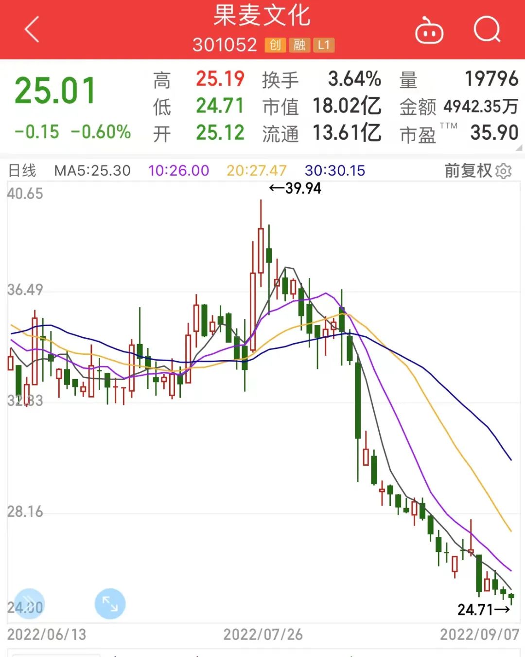 其次,从市值分布来看,超半数股票的A股市值低于50亿元。市值最高的是中国电信,最新A股市值接近3000亿元。该股于上市首日的盘中达到历史高点,此后股价震荡下行至今。市值最低的是果麦文化,市值不到20亿元,该股近期持续走低,9月7日再创历史新低。