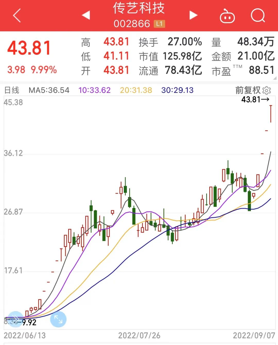 9月7日,传艺科技再度涨停,已经连续录得5个涨停板,最新收盘价创历史新高,A股市值突破120亿元。今年4月27日盘中,该股曾一度创下历史低点。不到5个月时间,该股完成逆袭,期间最大涨幅达到3.98倍。