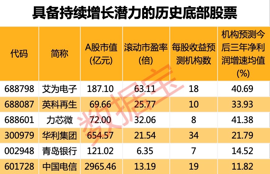 根据5家以上机构一致预测,上述半年报净利润增长的股票中,6股获机构预测今后三年净利润增速均超10%,分别是艾为电子、英科再生、力芯微、华利集团、青岛银行、中国电信。