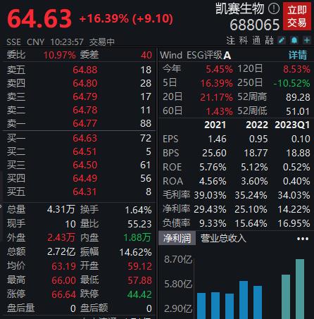 6月26日,受利好消息刺激,凯赛生物复牌大涨。截至发稿,该股涨超16%,报64.63元,此前一度涨超18%。