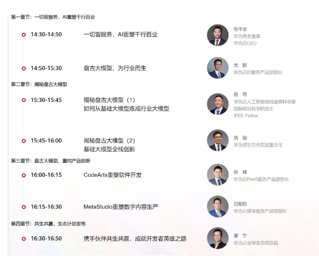 议程显示,华为常务董事、华为云CEO张平安将带来“一切皆服务,AI重塑千行百业”主题演讲,华为云EI服务产品部部长尤鹏、华为云人工智能领域首席科学家田奇、华为诺亚方舟实验室主任姚骏也将围绕盘古大模型发表主题演讲。同时,华为云PaaS服务产品部部长徐峰、华为云媒体服务产品部部长吕阳明、华为云全球生态部总裁康宁将分别围绕CodeArts、MetaStudio、开发者生态等方面发表主题演讲。