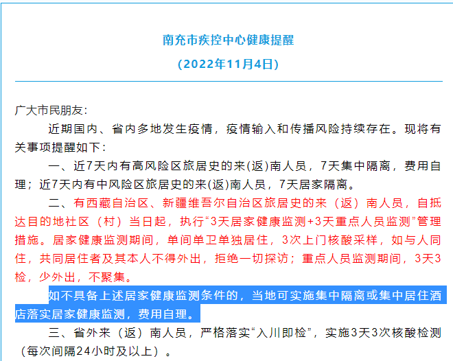 直至11月4日,南充疾控发布的健康提醒中仍有隔离费用自理这一条。