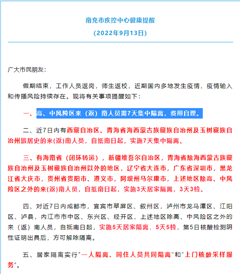 9月13日,四川南充市疾控中心曾发布健康提醒,里面提出高、中风险区来(返)南人员需7天集中隔离,费用自理。