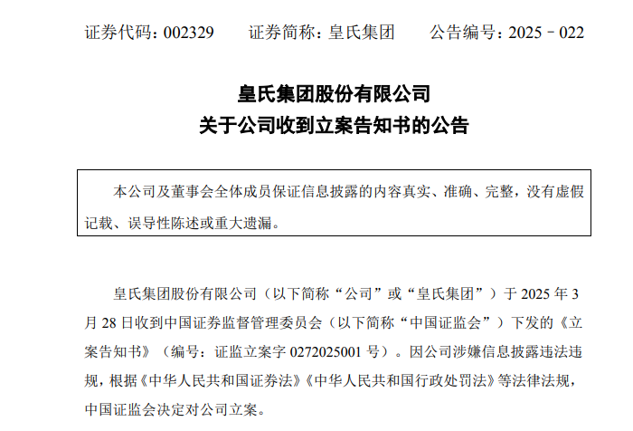 3月31日晚,皇氏集团(002329)公告,公司于3月28日收到证监会下发的《立案告知书》。因公司涉嫌信息披露违法违规,证监会决定对公司立案。