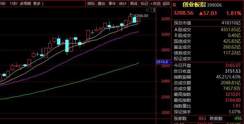 创业板指涨超2%,新能源权重涨幅居前,湖南裕能涨超13%,亿纬锂能涨超7%,阳光电源、宁德时代涨超4%。