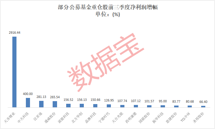 天齐锂业净利润增幅居首,高达29.16倍,主要系公司锂产品量价齐升所致;三季度公募基金对公司态度分化,东方基金和汇添富选择增持,汇丰晋信则大手笔减持;公募基金整体持仓天齐锂业占流通A股比例较半年报下降2.7个百分点。此外,中天科技净利润增幅达到400%;比亚迪和通威股份增幅超过200%。