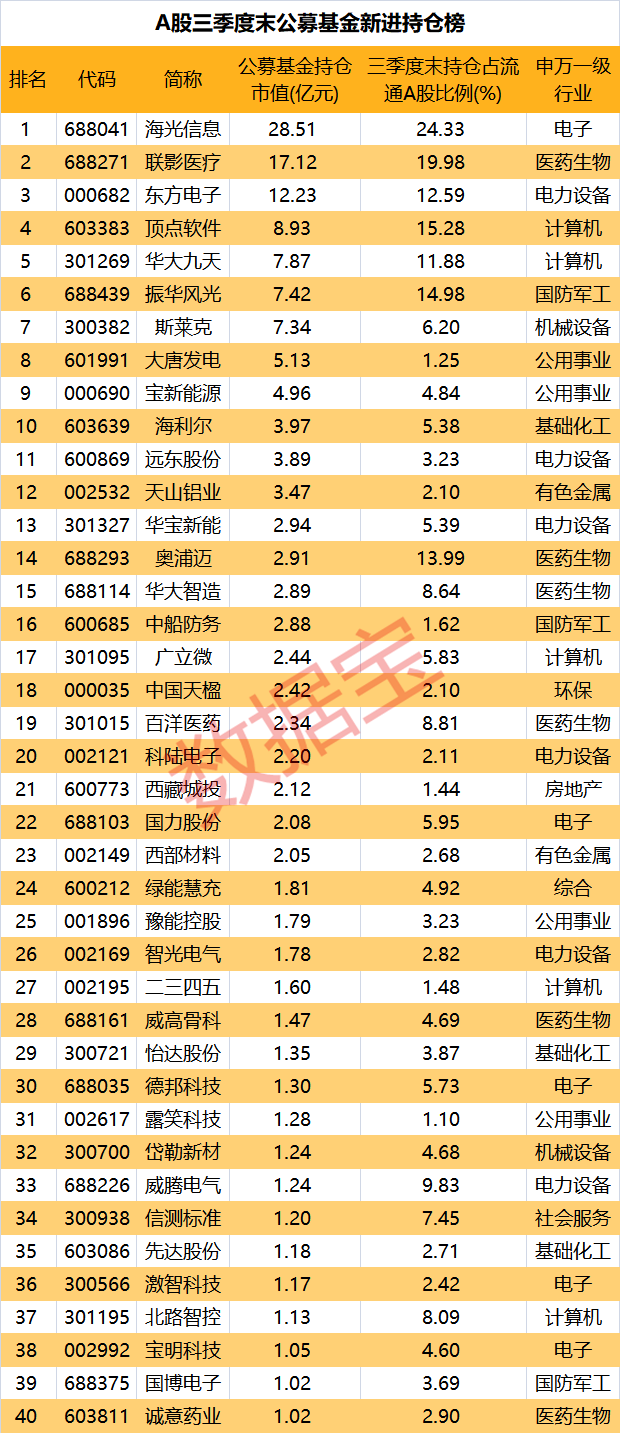 公募基金三季度40只新进股