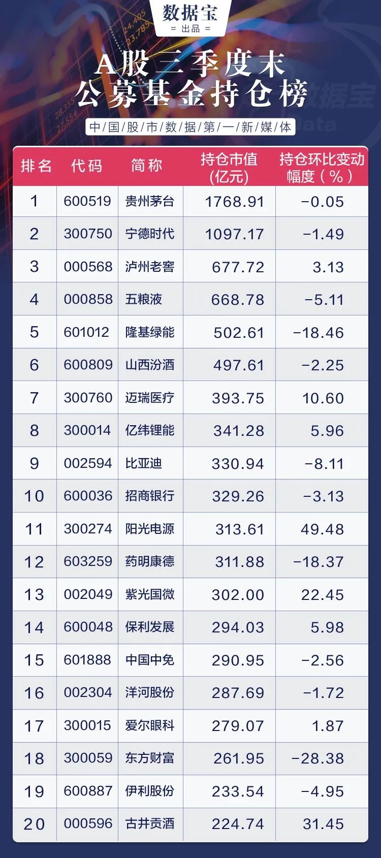 作为A股市场举足轻重的机构投资者,公募基金在大资管领域发展良好,发展势头有望延续。以公募基金三季报十大重仓股为统计口径,证券时报·数据宝发布《A股三季度末公募基金持仓榜》,详细解析公募基金持仓及动向。