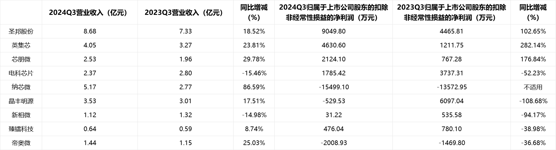 除此之外,英集芯(688209.SH)和芯朋微(688508.SH)的三季度业绩增长显著。英集芯本季度实现营收4.05亿元,同比增长23.81%,归属于上市公司股东扣非净利润4630.60万元,同比增长282.14%;芯朋微实现营收2.53亿元,同比增长29.78%,归属于上市公司股东扣非净利润2124.10万元,同比增长176.84%。
