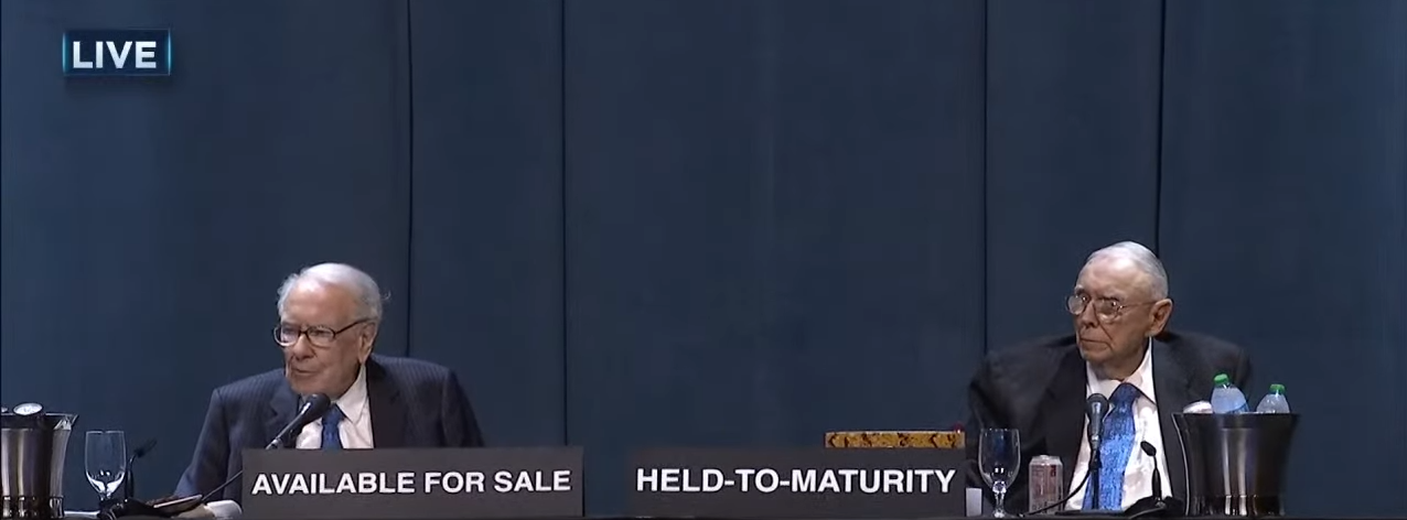 从股东会一开始,巴菲特面前便摆放了两块黑色的牌子。而在股东会Q&A阶段进入下半场,终于有提问者问及银行业危机时,巴菲特才将这两块牌子翻转过来,揭晓了上面的答案:巴菲特在自己面前放了一个写着“可供出售”的牌子,并在芒格面前放了一个写着“持有至到期”的牌子,这个幽默举动立刻引起了现场哄堂大笑和掌声。