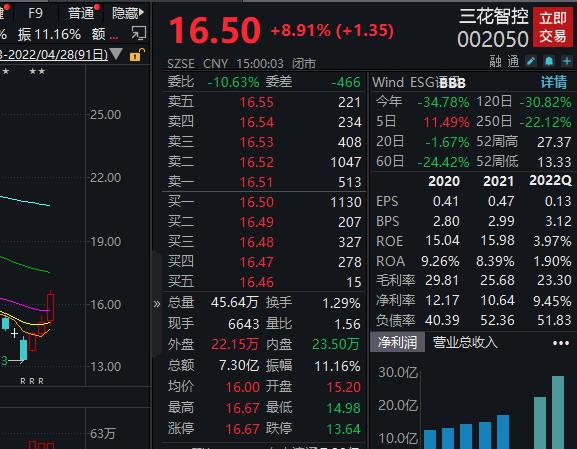 4月28日,截至今日收盘,三花智控涨8.91%,报16.5元。该股三日累涨近24%。