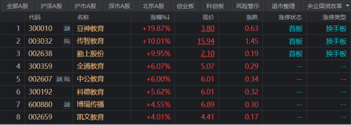 今日(6月13日),沪、深两指弱势震荡,科创50指数跌幅超1%,房地产、电力、银行等板块跌幅居前,汽车产业链相关板块则继续活跃。此外,近期持续回暖的教育板块今日大爆发,板块领涨两市且指数超4%,个股方面,豆神教育、传智教育、勤上股份涨停,全通教育、中公教育涨幅超6%。