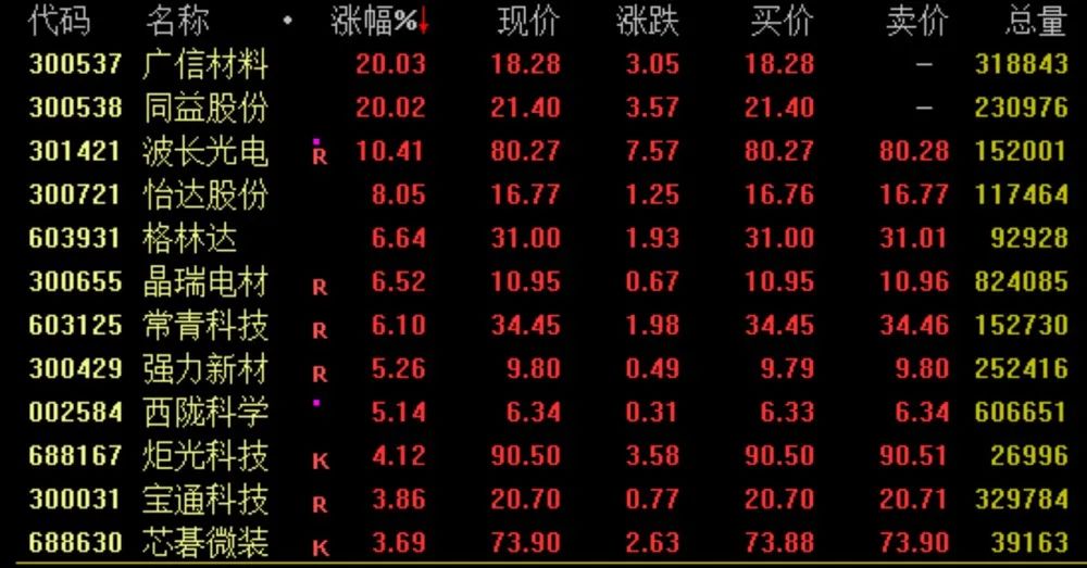光刻胶概念强势拉升,截至收盘,广信材料、同益股份“20cm”涨停,波长光电涨超10%,怡达股份涨逾8%,格林达、晶瑞电材、常青科技等涨逾6%。