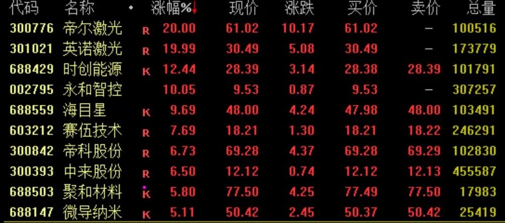 BC电池概念集体走高,截至收盘,帝尔激光、英诺激光“20cm”涨停;时创能源涨超12%;爱旭股份、永和智控亦涨停;海目星涨近10%;隆基绿能涨近4%,总市值超2000亿元。