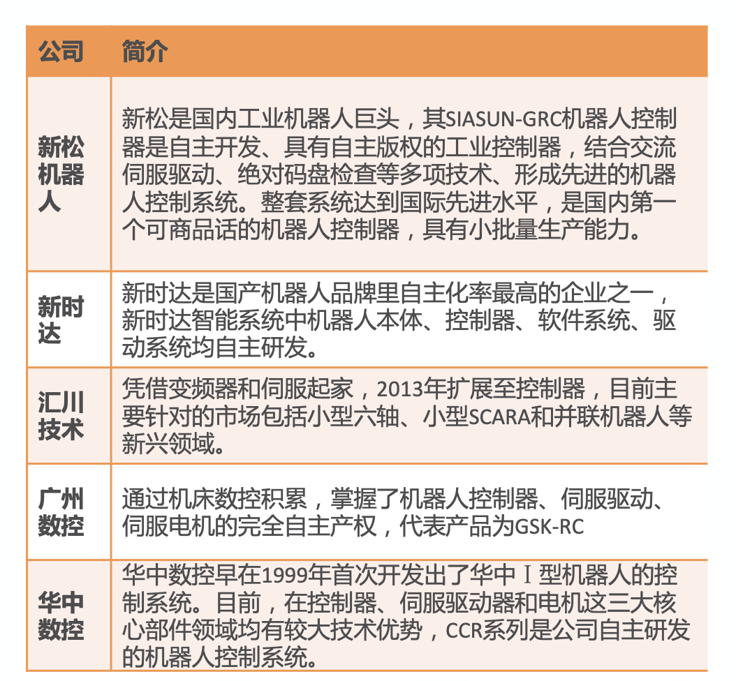而在控制器市场,天风证券李鲁靖等人指出,国内企业控制器尚未形成市场竞争力,工业机器人控制器国产率不足20%,代表性的企业目前有新时达、汇川技术等。