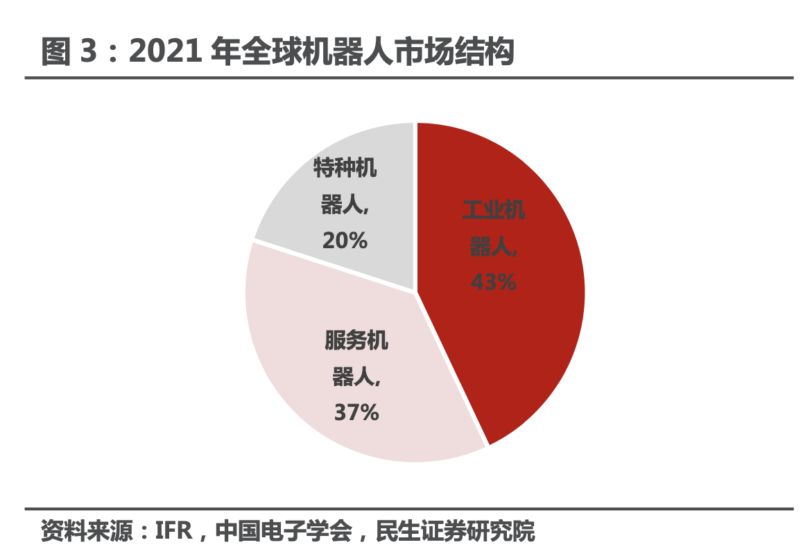 资料显示,当前机器人被划分为工业机器人、服务机器人、特种机器人三类。民生证券7月10日研报援引的数据资料显示,2021年工业机器人在全球机器人市场中占比最高(43%),我国工业机器人销量占全球销量的比重达52.88%,预计到2023年国内工业机器人市场规模将突破589亿元。
