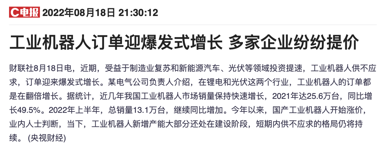 据央视财经报道,近期,受益于制造业复苏和新能源汽车、光伏等领域投资提速,工业机器人供不应求,订单迎来爆发式增长,国产工业机器人今年以来开始涨价。某电气公司负责人介绍,在锂电和光伏这两个行业,工业机器人的订单都是在翻倍增长。