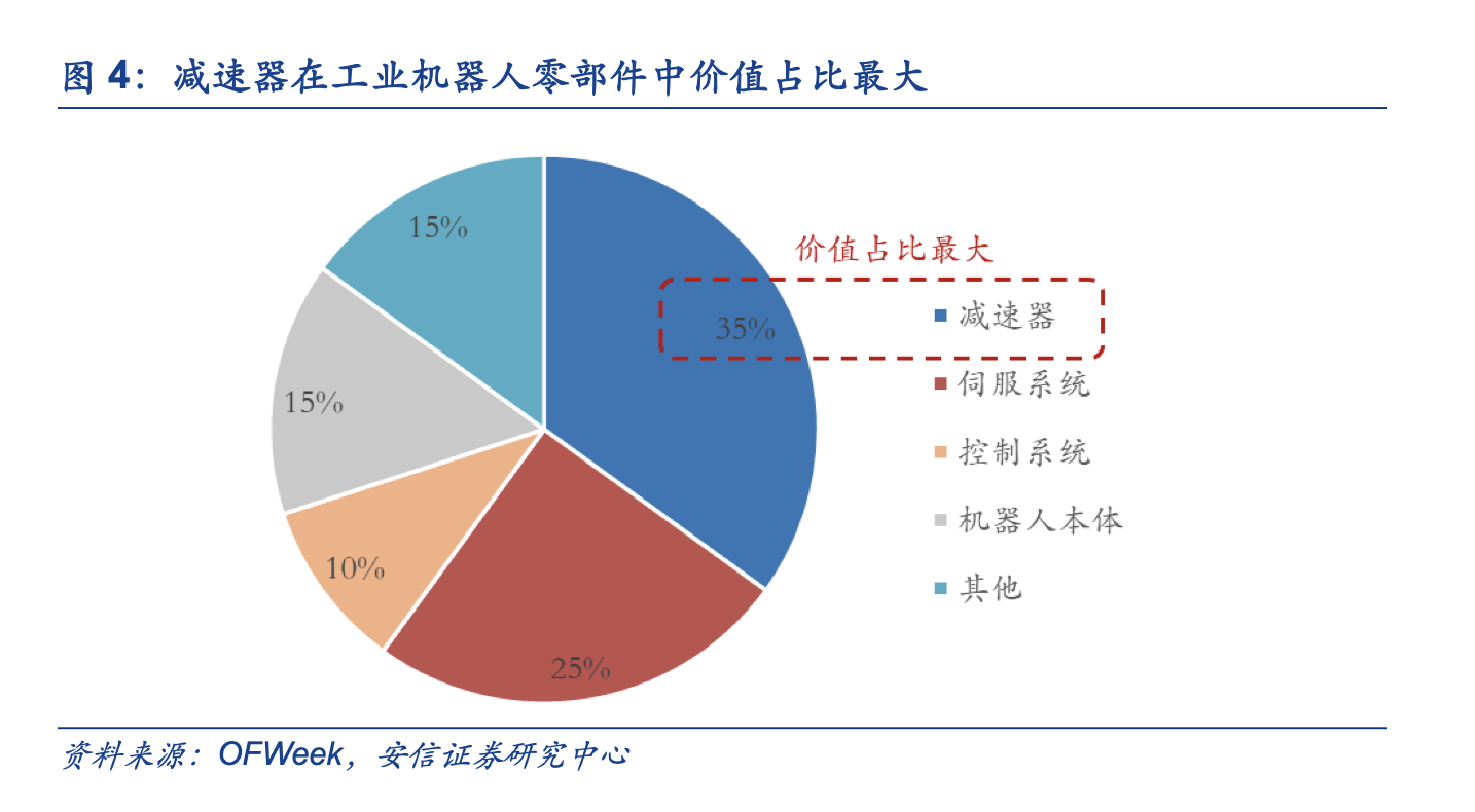 另一方面,根据OFWeek数据显示,工业机器人三大核心零部件包括减速器/伺服系统/控制系统,价值量占比分别为35%/25%/10%。