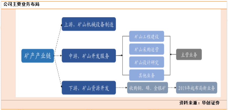公司的主营业务为包括以矿山工程建设、采矿运营管理、矿山设计与技术研发在内的矿山开发服务业务,并不断在矿山产业链上下游培育新的业务增长点,形成了集矿山开发服务、矿山机械设备制造等业务一体化的矿山综合服务能力,服务对象为大中型非煤类地下固体矿山,涉及矿山资源品种主要包括铜、铅、锌、铁、镍、钴、金、银、磷等。