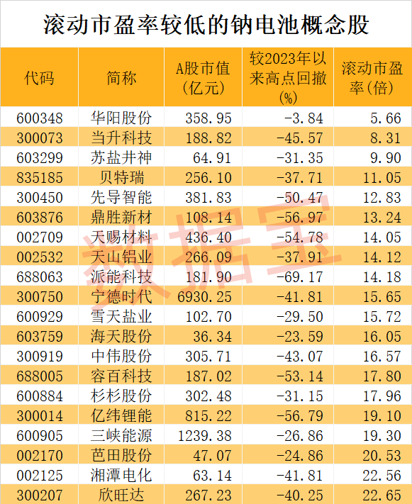 在大幅度调整之后,钠电池概念股估值水平进一步下移。目前滚动市盈率低于20倍的有17只,其中华阳股份、当升科技、苏盐井神市盈率不到10倍。