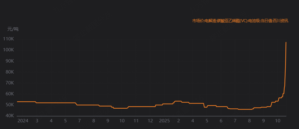 VC (碳酸亚乙烯酯)是锂电池电解液中核心成膜添加剂,在电池充放电过程中形成稳定 SEI 膜,提升循环寿命和安全性,被誉为锂电池的 "维生素"。电池首次充放电时,在电极表面形成均匀、致密且稳定的 SEI 膜(固体电解质界面膜)。阻止电解液进一步分解,提升电池循环寿命、充放电效率和安全性能,同时降低内阻。11 月 12 日:全球最大 VC 供应商山东亘元突发停产检修(占全球产能约 30%左右),从而引发市场VC价格开始持续涨价。价格从低位的4.5万元/吨,上涨到11万元/吨。