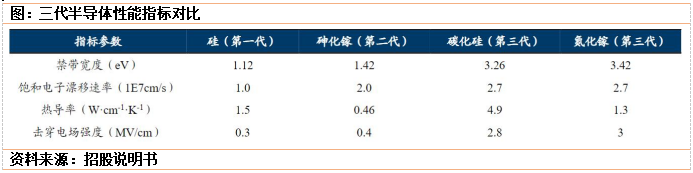 SiC属于第三代半导体,性能参数优异。以碳化硅为代表的第三代半导体材料具有禁带宽度大、饱和电子漂移速率高、热导率高、击穿电场高强度等优势: