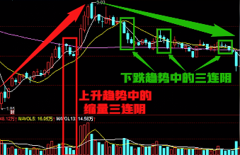 第四,看趋势。在上升趋势中的缩量三连阴多为洗盘,但在下跌趋势中三连阴则是中继。