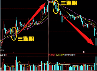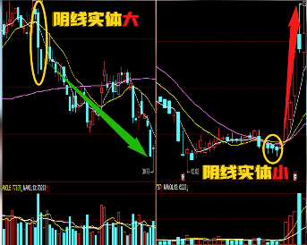 第二,看大小。在高位以出货为主的三连阴阴线实体大,而低位的用来洗盘的三连阴,实体较小。