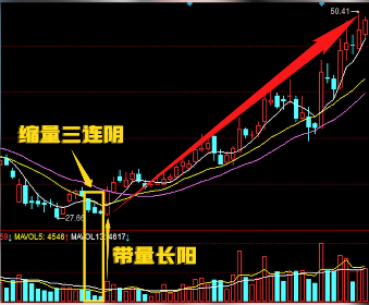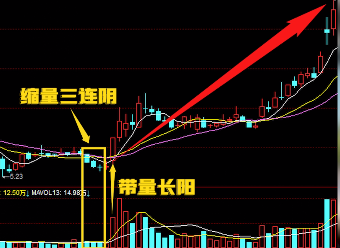 这一例也是缩量三连阴,加上带量长阳行情启动。