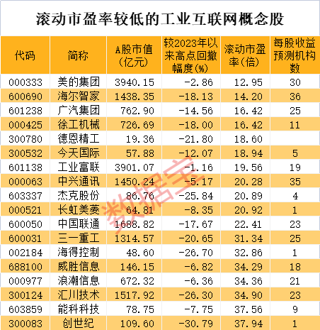 截至6月9日收盘,滚动市盈率低于40倍的工业互联网概念股有18只。美的集团滚动市盈率12.95倍排在最低位置,该股近日股价逐渐回升,成交也趋向活跃。数据宝统计,美的集团6月以来日均成交21.86亿元,环比5月份提升110.88%。市盈率较低的概念股还有海尔智家、广汽集团、徐工机械、德恩精工、今天国际等。