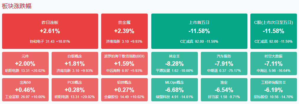 全市场超4800只个股下跌,逾百股跌停或跌超10%,上涨个股仅500余只。盘面上,PCB概念股逆势走强,明阳电路、金百泽、协和电子、中京电子等涨停。贵金属概念股展开反弹,玉龙股份涨停,晓程科技涨超5%。航运股一度冲高,九丰能源涨停,中远海特涨超5%。下跌方面,车路云概念股集体调整,安车检测等多股跌超10%。板块方面,贵金属、PCB等少数板块上涨,新型城镇化、数字经济、车路云、教育等板块跌幅居前。