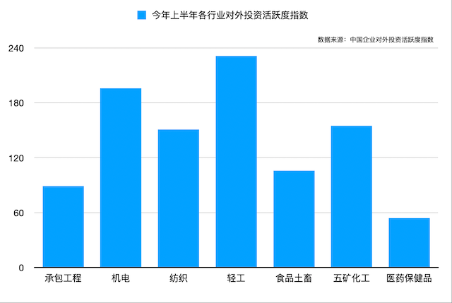 从各行业商会发布的具体数据来看,今年前6个月,我国轻工企业的对外投资活跃度最高,指数达到231,意愿指数303和实际指数182均处于高度活跃状态。6月的活跃度指数为225,同比上涨46.1%。