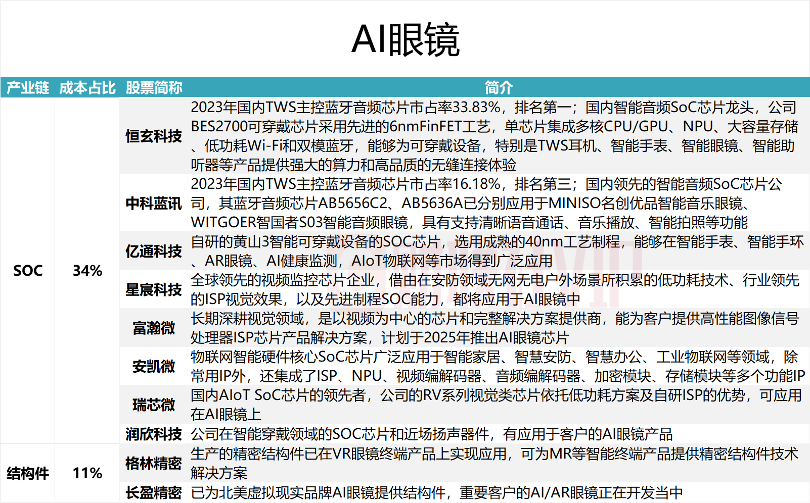据梳理,在AI眼镜产业链中,成本占比超11%的领域为SOC和结构件,涉及上市公司包括恒玄科技、中科蓝讯、亿通科技、星宸科技、富瀚微、安凯微、瑞芯微、润欣科技、格林精密和长盈精密,具体情况详见下图: