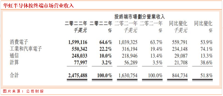 按终端市场划分,华虹半导体第一大业务为消费电子,同比增长53.9%,占比64.6%;工业和汽车电子为第二大业务,同比增长74.1%,占比22.2%;通信领域为第三大业务,同比增长13.3%,占比10%;计算业务同比增长38.6%,占比3.2%。