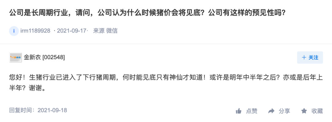 金新农回复称:“生猪行业已进入下行猪周期,何时能见底只有神仙才知道!或许明年中半年之后?亦或后年上半年?”