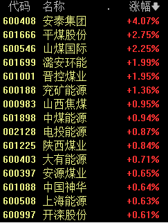 煤炭板块上午表现活跃,安泰集团等涨幅居前。