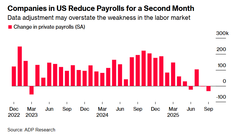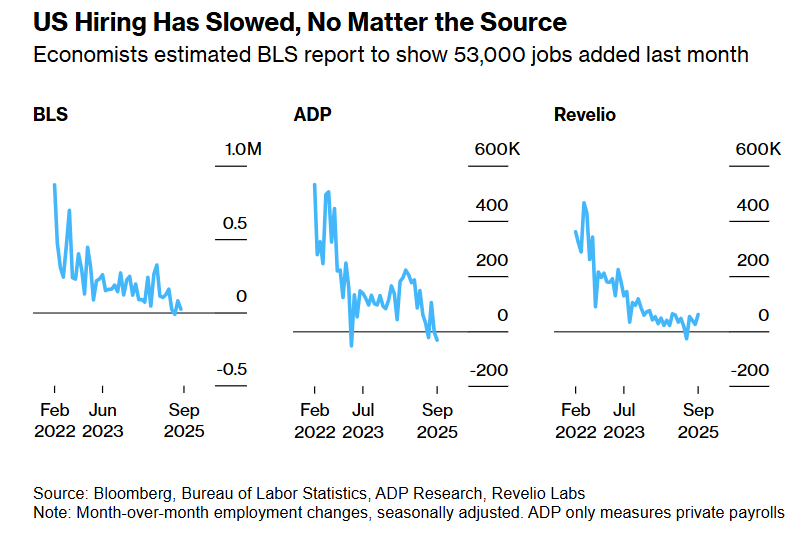 即便没有来自美国劳工统计局(BLS)的重磅非农数据(由于美国政府停摆,本周五未能及时发布,具体的数据发布时间处于待定状态),近日公布的一系列私营部门统计指标也指向9月美国企业整体招聘活动进一步疲软、裁员有限、薪资温和增长以及企业对劳动力需求放缓。