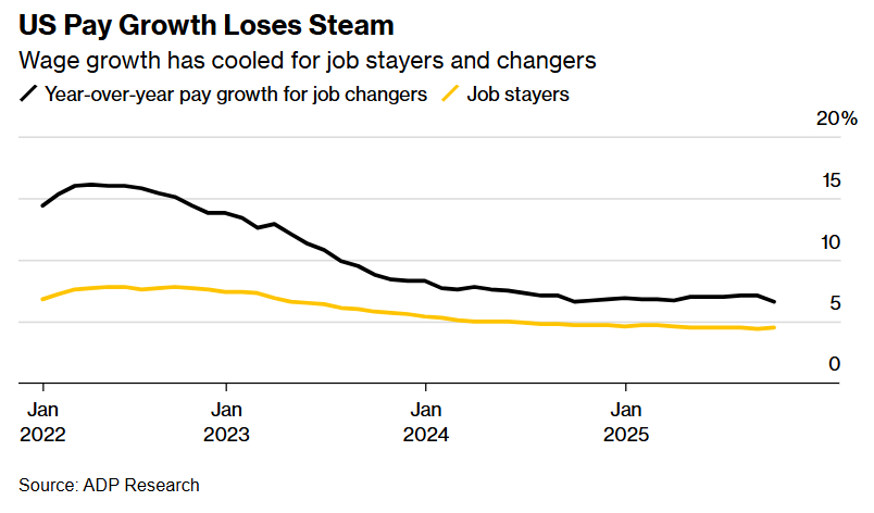 与此同时,薪资增长速度仍在推进中但是增速显著放缓。BLS统计数据显示,自2023年年中以来,薪资涨幅平均一直跑赢通胀,但近期优势有所收窄。ADP的就业报告显示,换工作者们的薪资增幅继续放缓,而“留任者”的薪资基本没有变化。