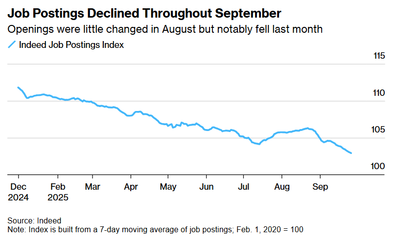 尽管政府数据最受信任,但职位空缺调查常因回应率低、修订幅度较大而饱受市场批评。招聘网站Indeed的另一项每日基准指数显示,8月职位空缺变化不大,而9月降幅更为明显。