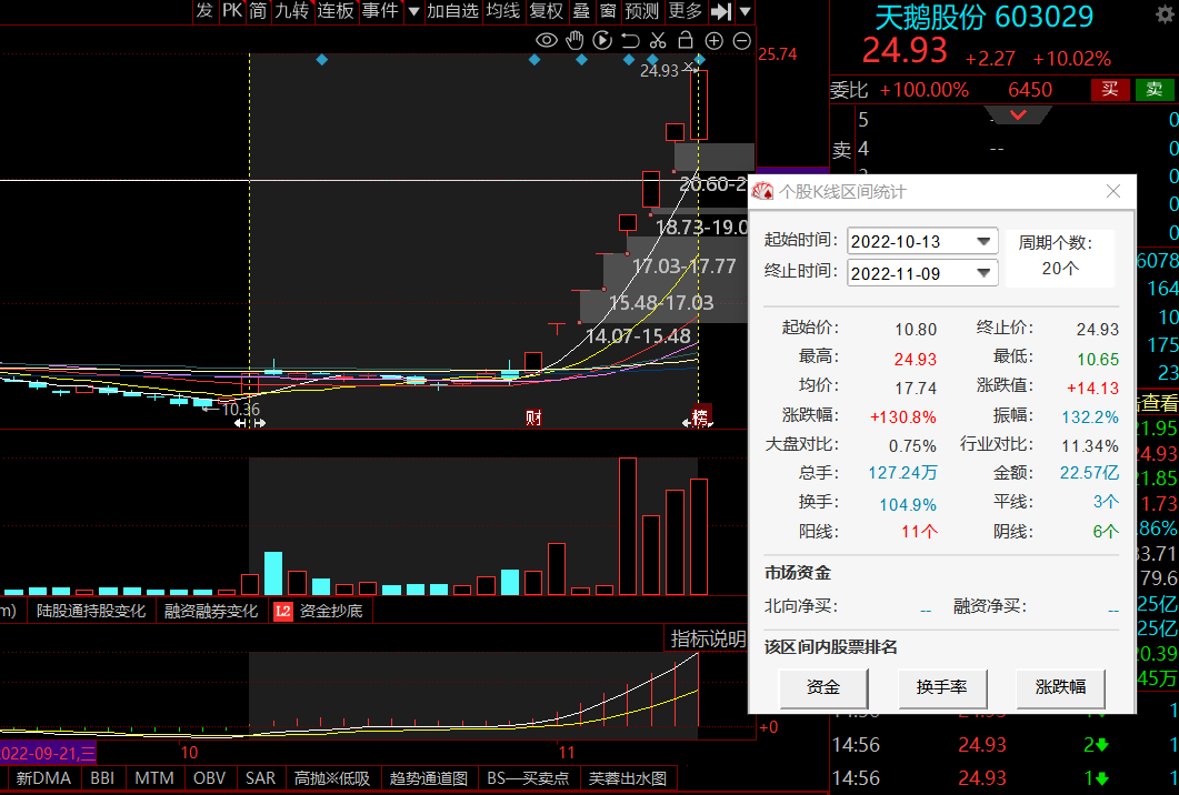 天鹅股份高开高走早早封死涨停直至收盘,拿下八连板,成两市最高标。在其所属的供销社概念板块中,天鹅股份20日涨幅超130%,位列板块第一。