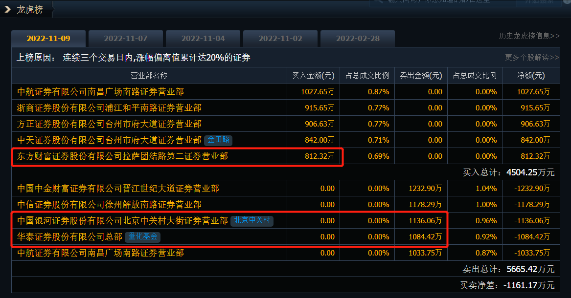 背后哪些资金在“兴风作浪”呢?天鹅股份盘后公布的三日榜显示,龙虎榜资金净卖出1161.17万元。素有“散户大本营”之称的东财拉萨团结路买入812.32万元。在11月7日公布的龙虎榜中位列买一、买二的华泰证券总部、中国银河证券北京中关村大街营业部则分别卖出1084.42万元、1136.06万元。