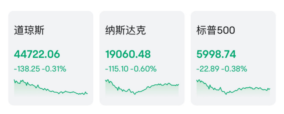 当地时间11月27日,美国三大股指小幅收跌。截至收盘,道指跌0.31%报44722.06点,标普500指数跌0.38%报5998.74点,纳指跌0.60%报19060.48点。