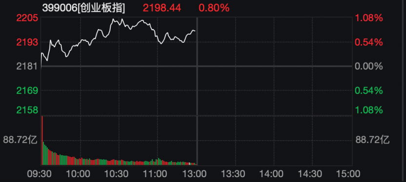 创业板指数进一步上行,盘中涨超1%,突破2200点整数关口。