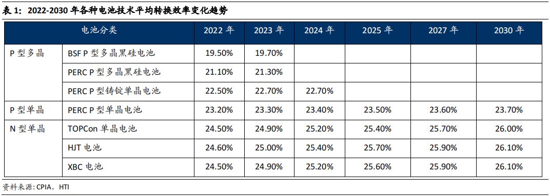 技术上,N型电池的制备技术主要包括隧穿氧化层钝化接触电池(TOPCon)、本征薄膜异质结电池(HJT)、背电极接触电池(XBC)等。其中,TOPCon和HJT凭借更为成熟的制备技术成为N型电池的主流。相比P型光伏电池产品,N型电池的光电转换效率更高。截至2022年,N型TOPCon电池平均转换效率达到24.5%,HJT电池平均转换效率达到24.6%。